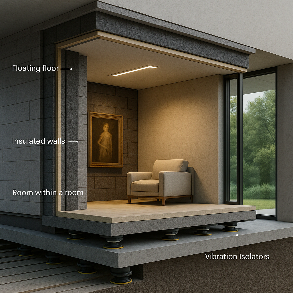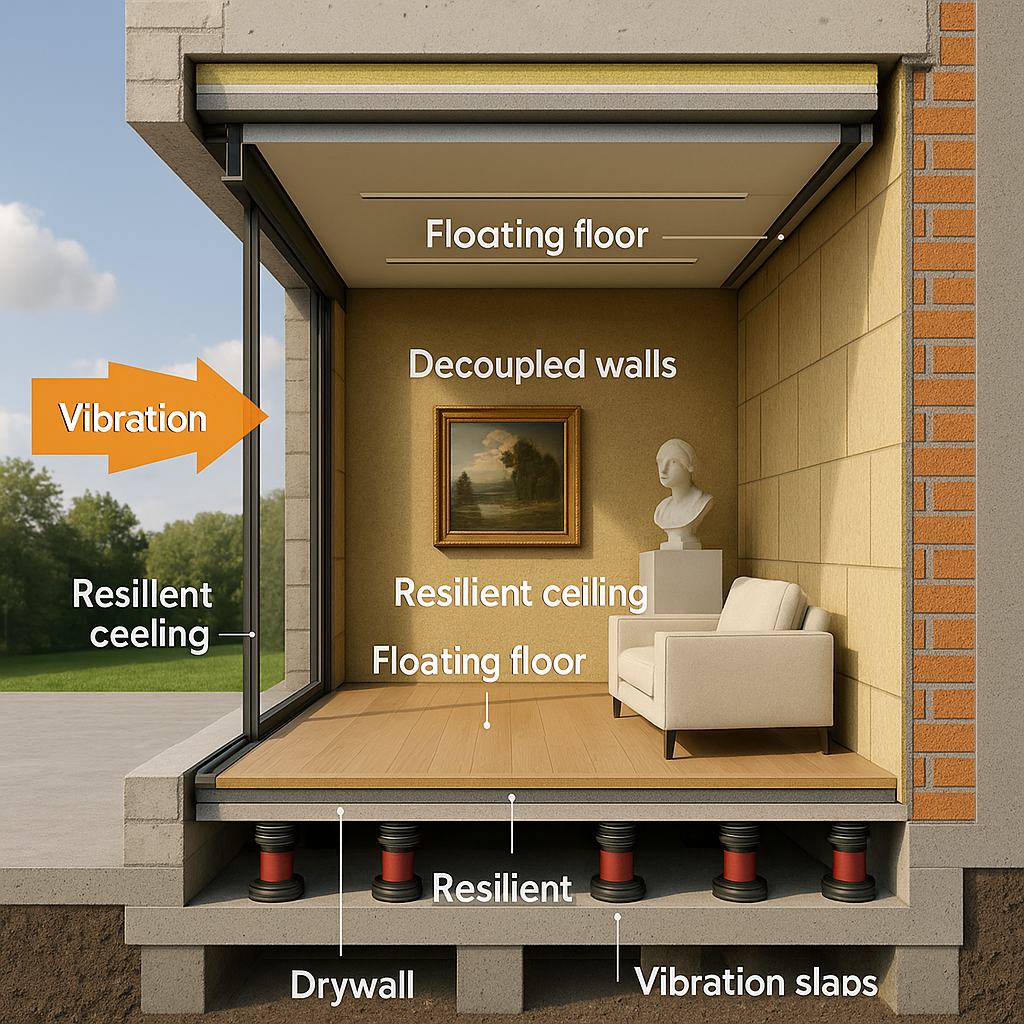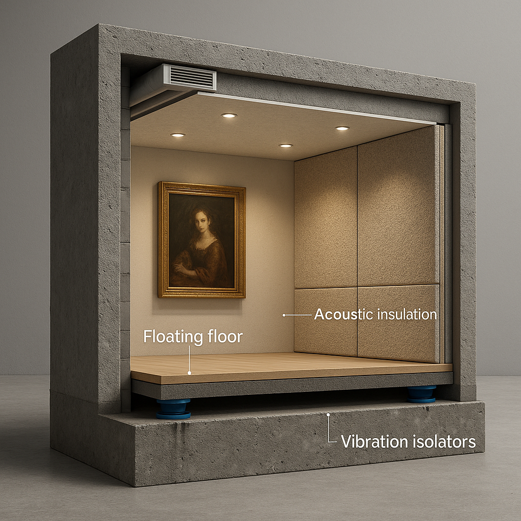 Для уже построенных зданий или для создания зон с повышенными требованиями к стабильности (например, винного погреба или хранилища часов) применяется принцип «комната в комнате». Эта технология предполагает строительство внутри основного помещения независимой внутренней конструкции. Пол такой комнаты представляет собой «плавающую» стяжку, уложенную на слой вибродемпфирующего материала. Стены и потолок крепятся к основной конструкции через специализированные виброизолирующие подвесы и крепления (например, Виброфлекс), которые гасят структурные колебания.